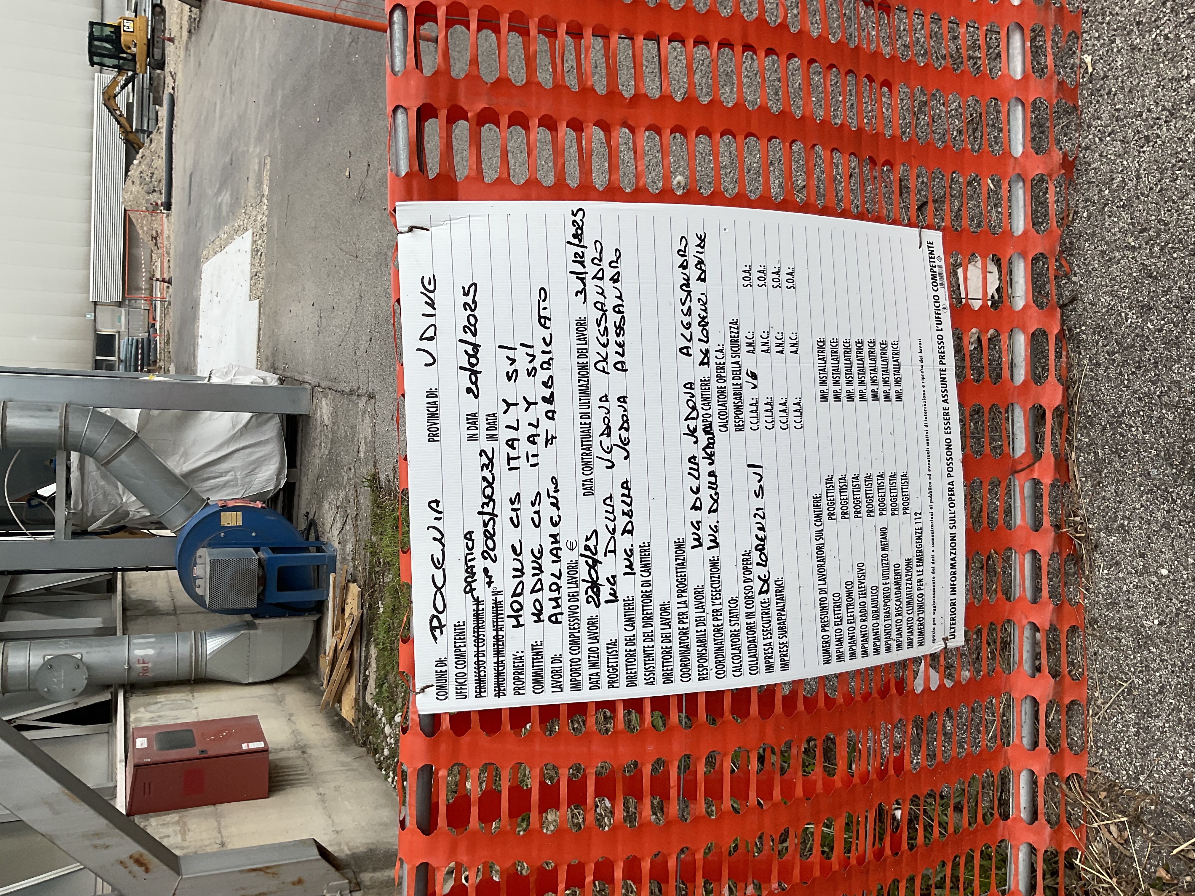 Modificare il cartello di cantiere, l’Ing. Della Vedova ha il ruolo di CSP CSE e responsabile dei lavori. Portare baracca di cantiere, estintori e cassetta primo soccorso. Completare recinzione di cantiere dietro alla tenso struttura. PER LA COMMITTENZA: Prestare attenzione ad operai che escono dallo stabilimento, sostando nell’area di cantiere.
