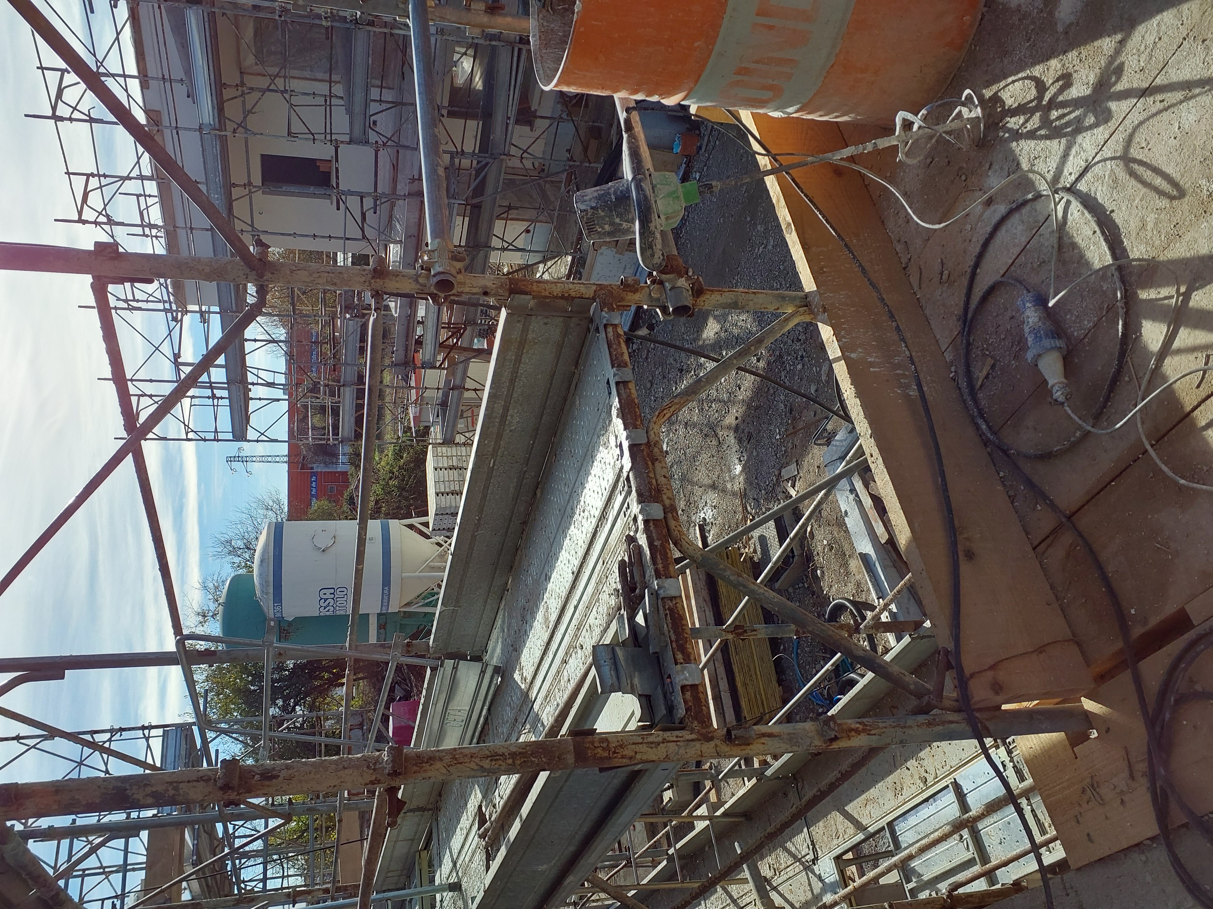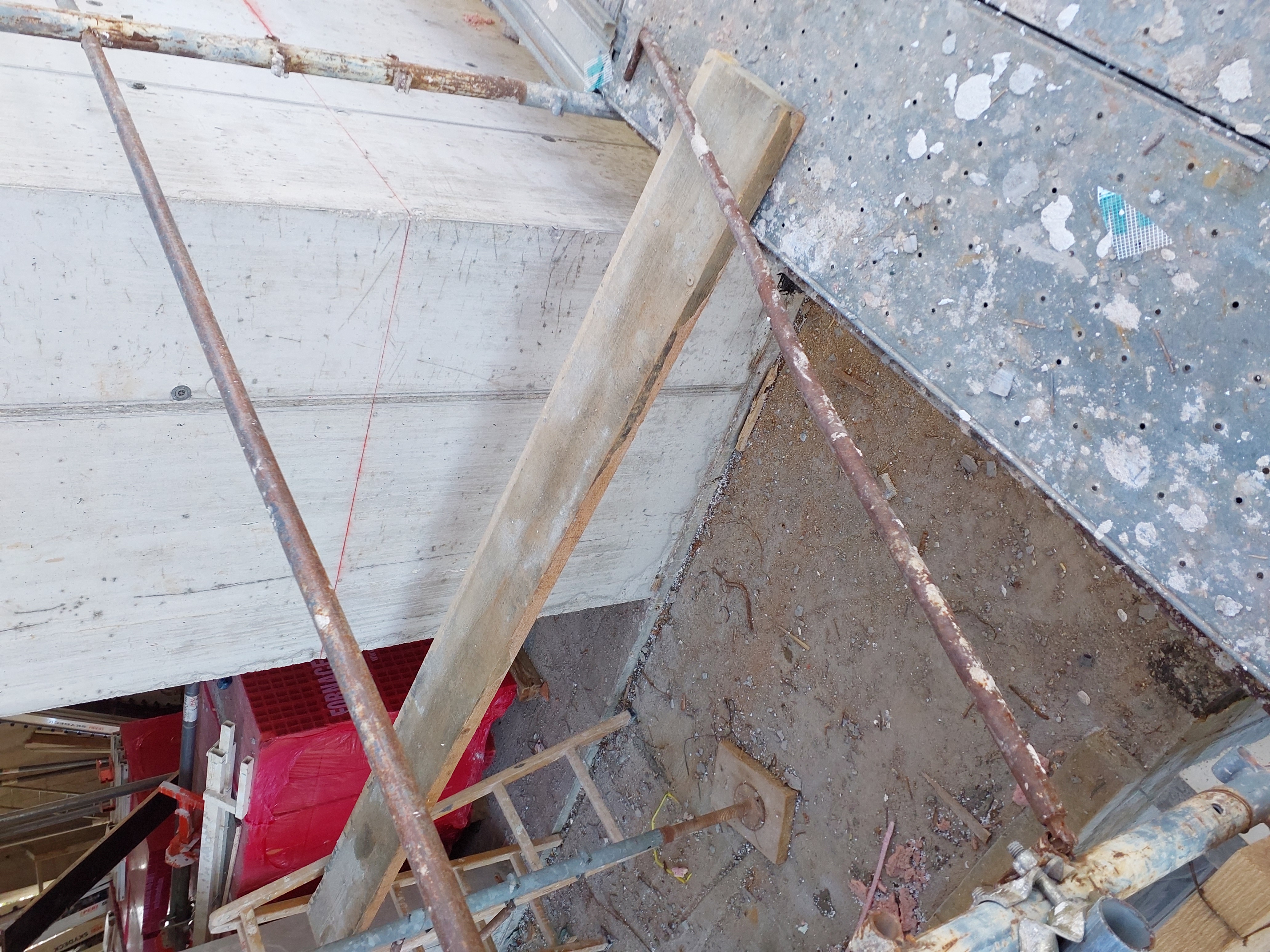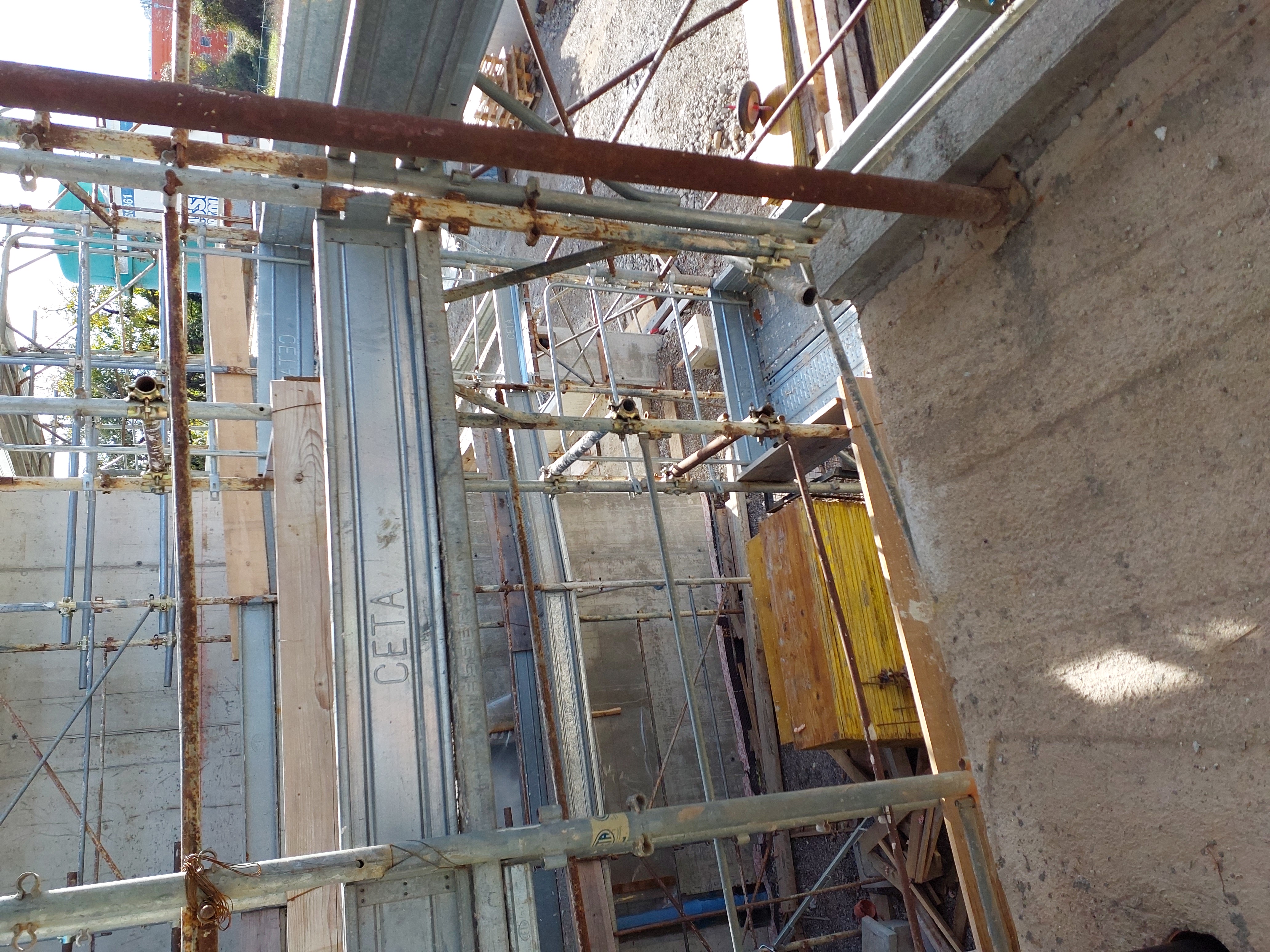 Rilievo fotografico edificio lato est. Sistemare i ponteggi e le scale prima di riprendere I lavori. Mettere in sicurezza i lavori in quota e gli accessi ai piani superiori
