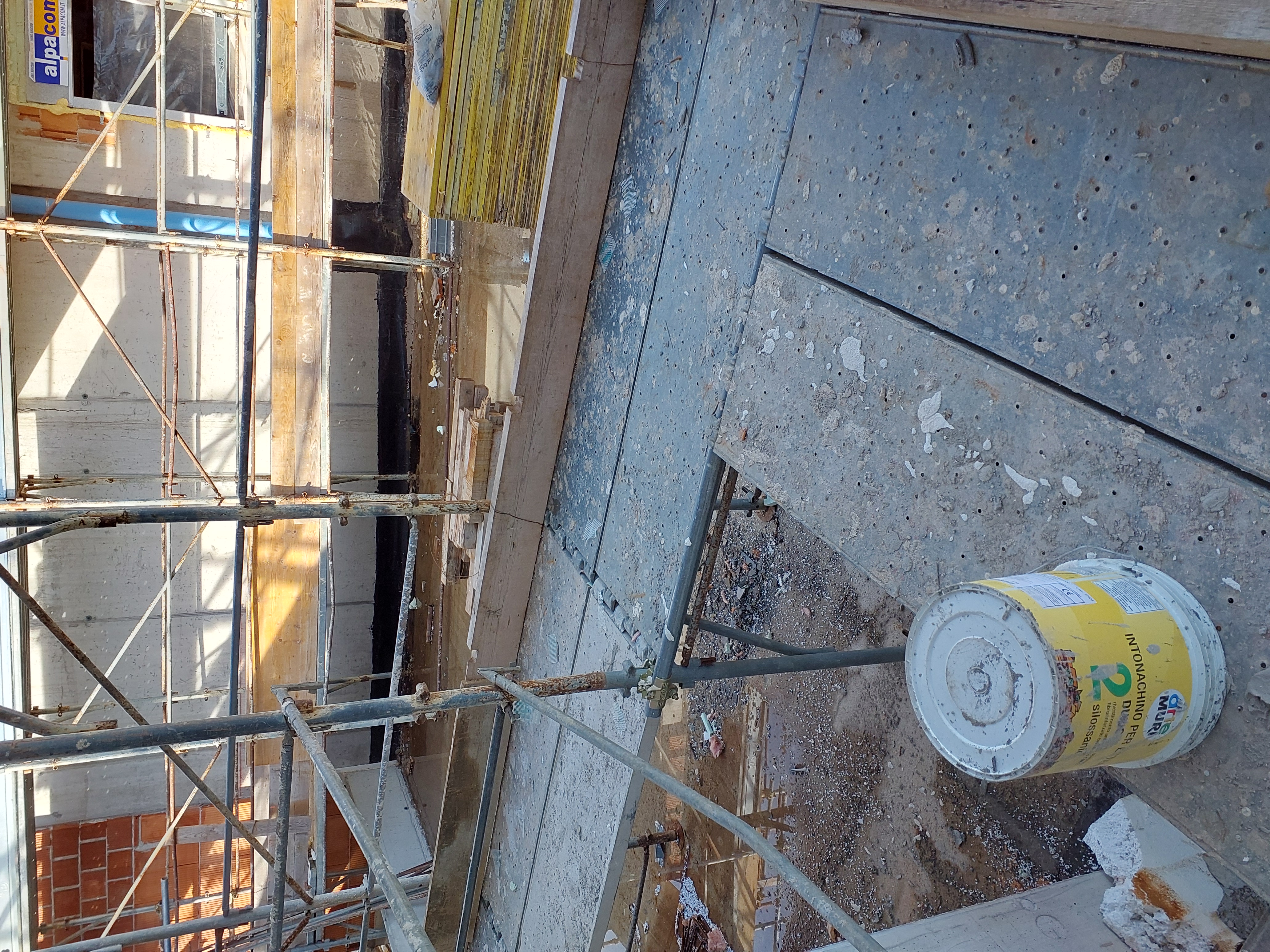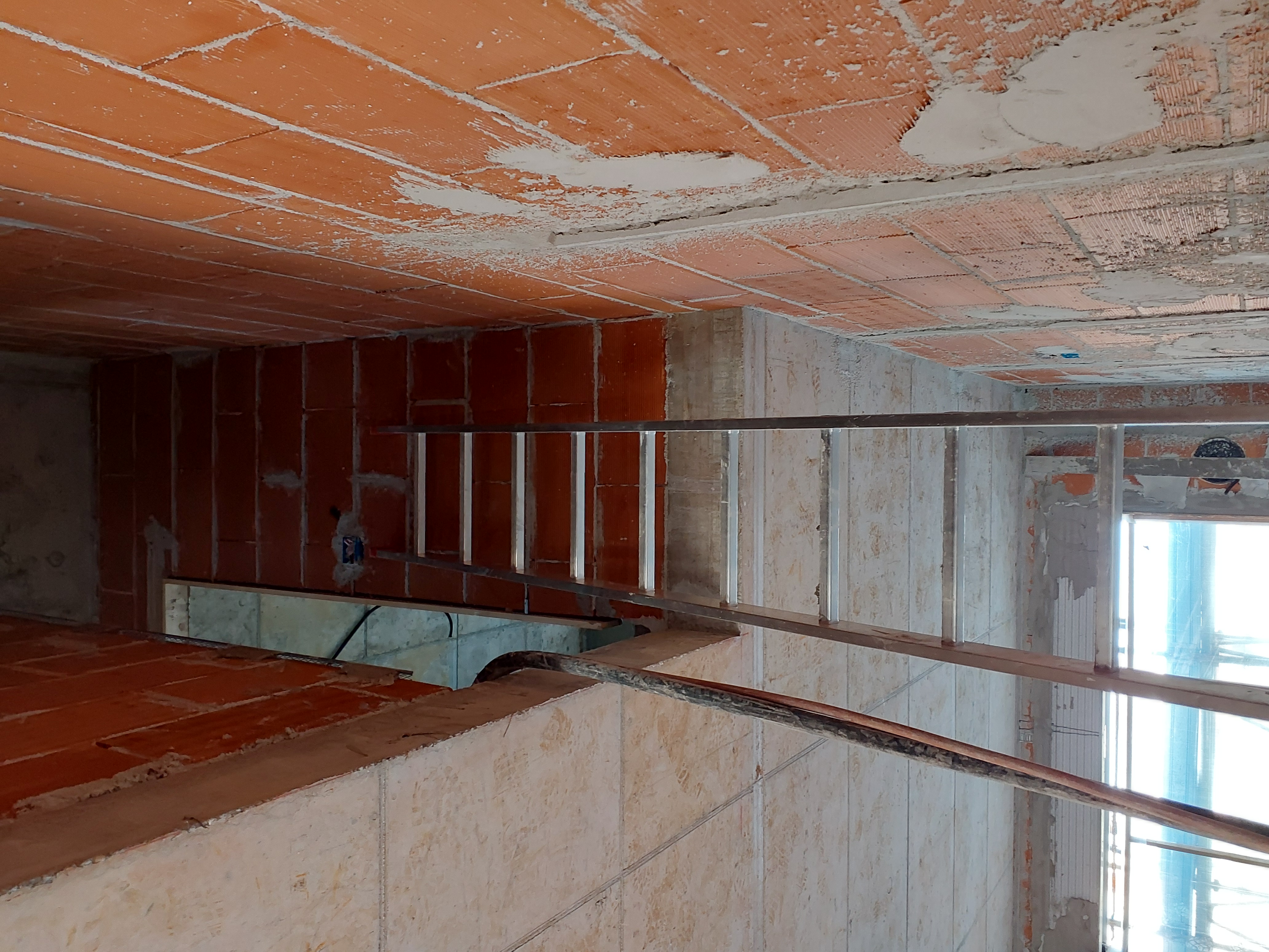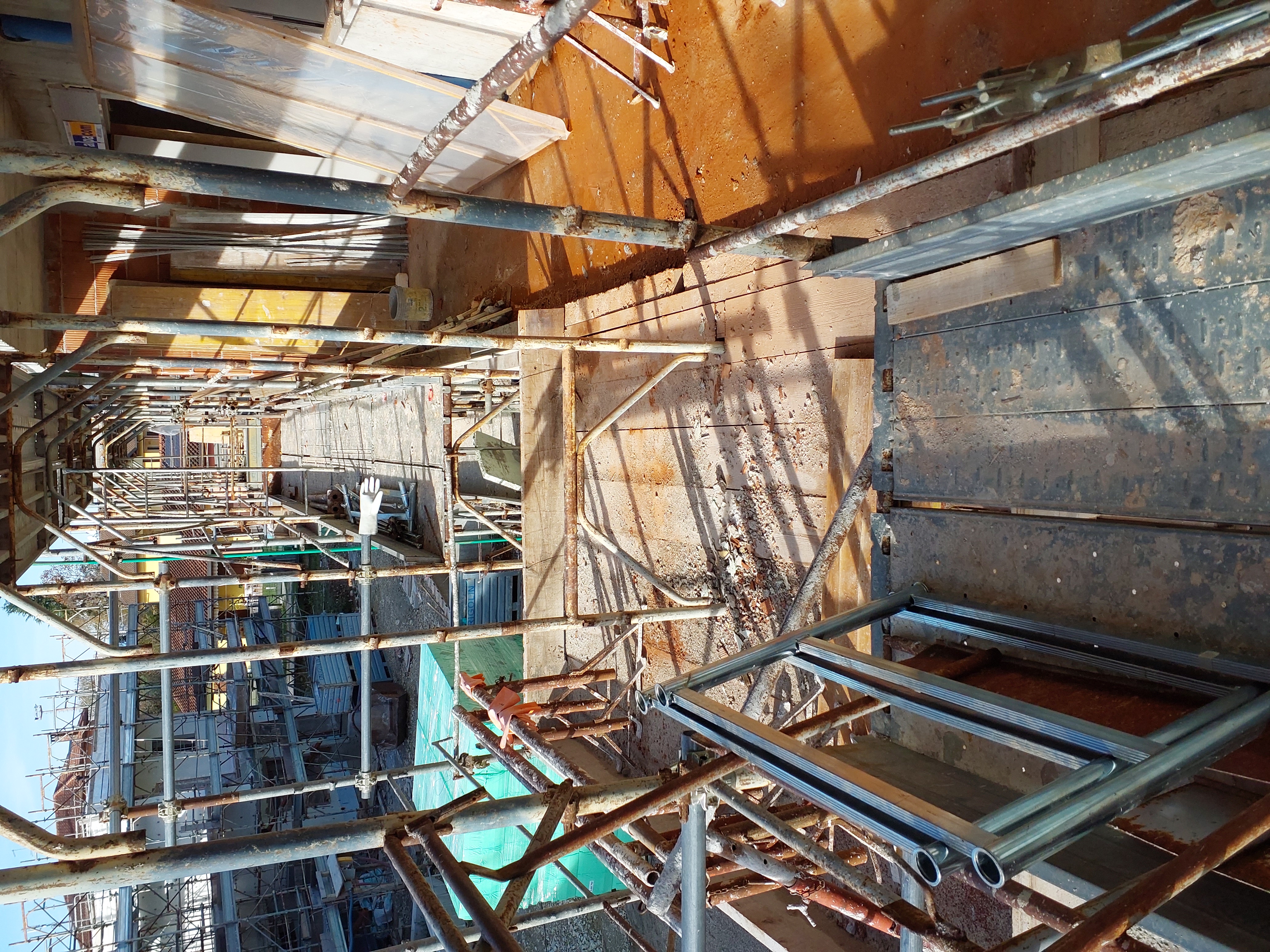 Rilievo fotografico edificio lato est. Sistemare i ponteggi e le scale prima di riprendere I lavori. Mettere in sicurezza i lavori in quota e gli accessi ai piani superiori