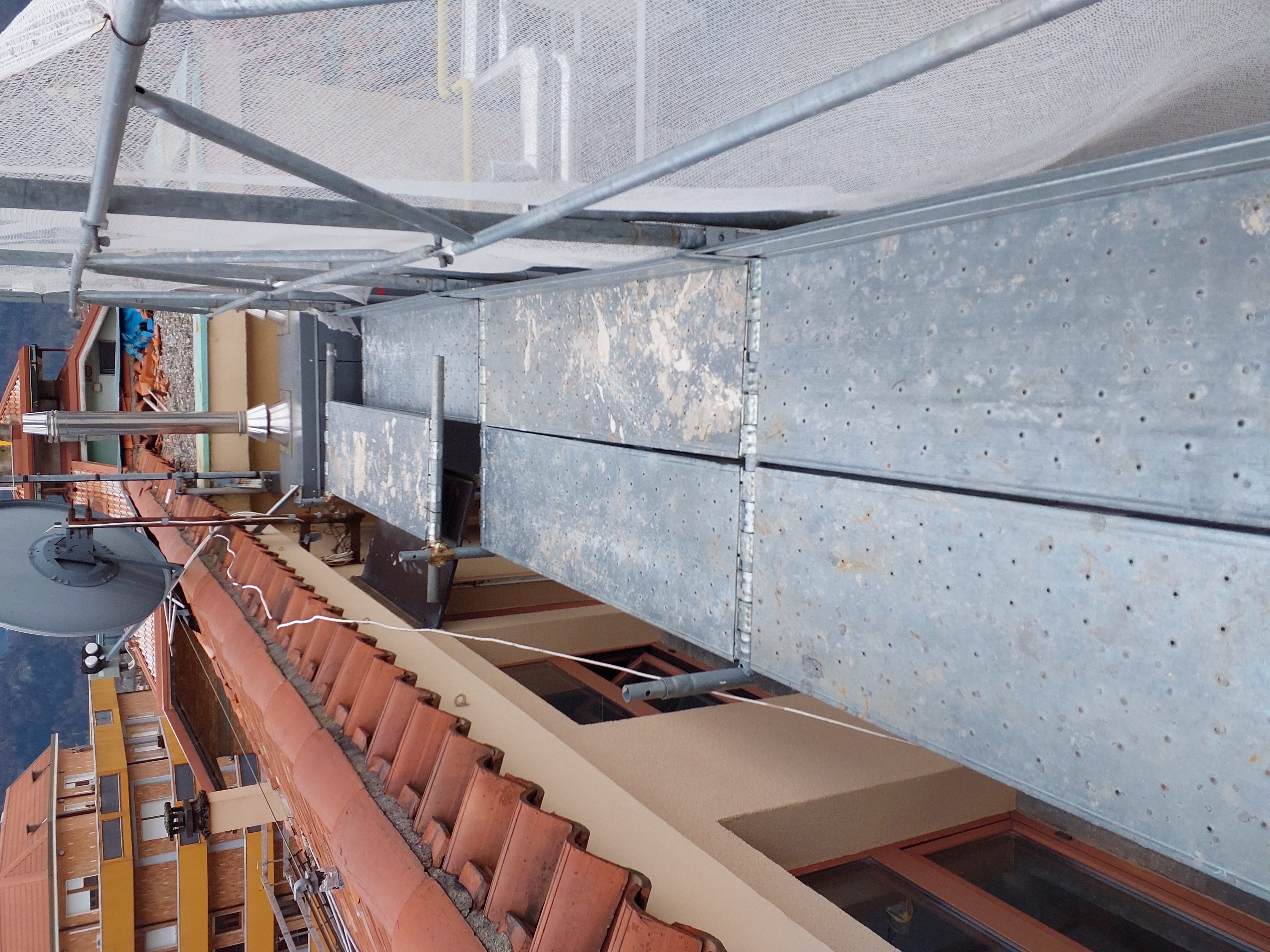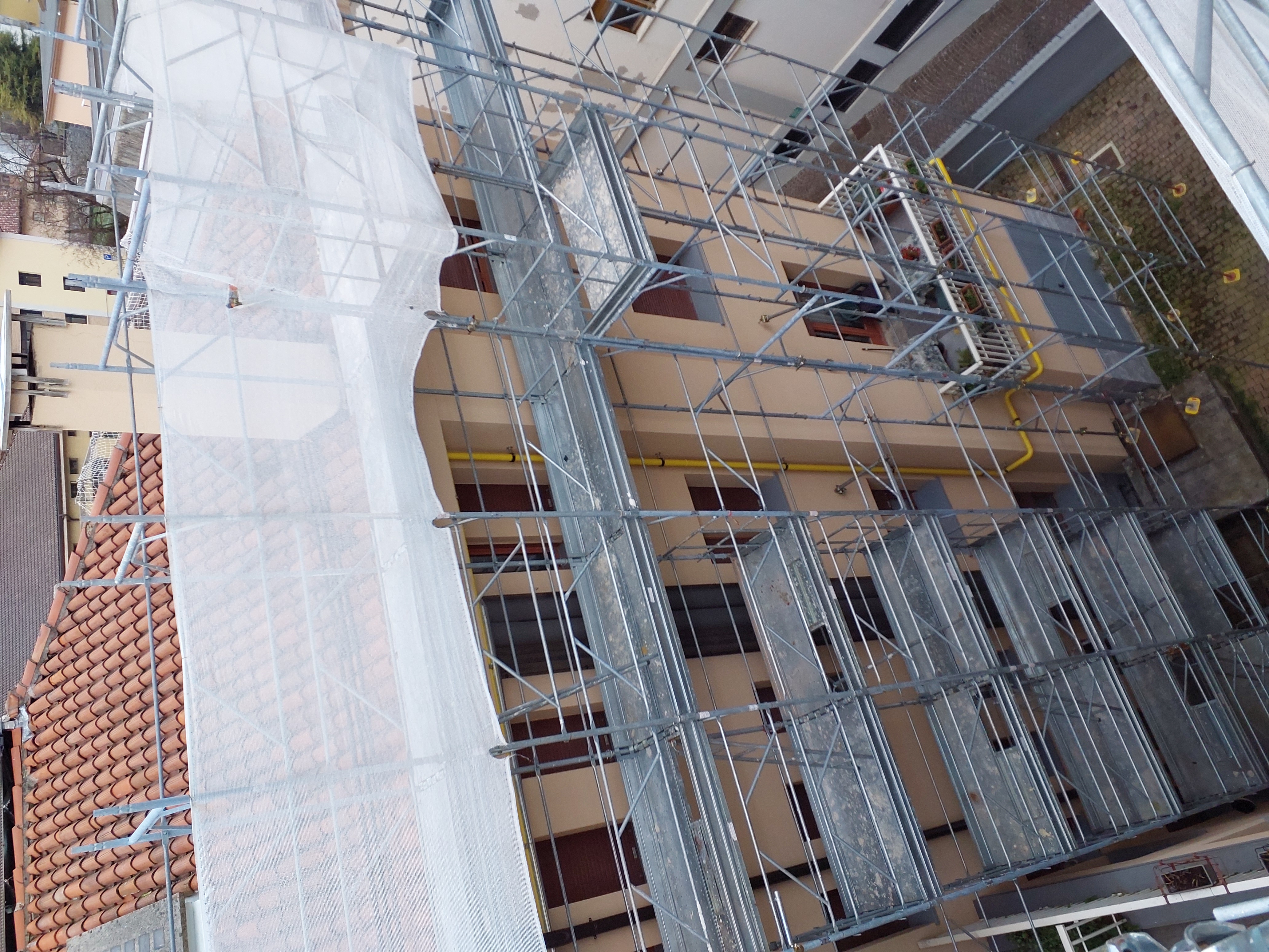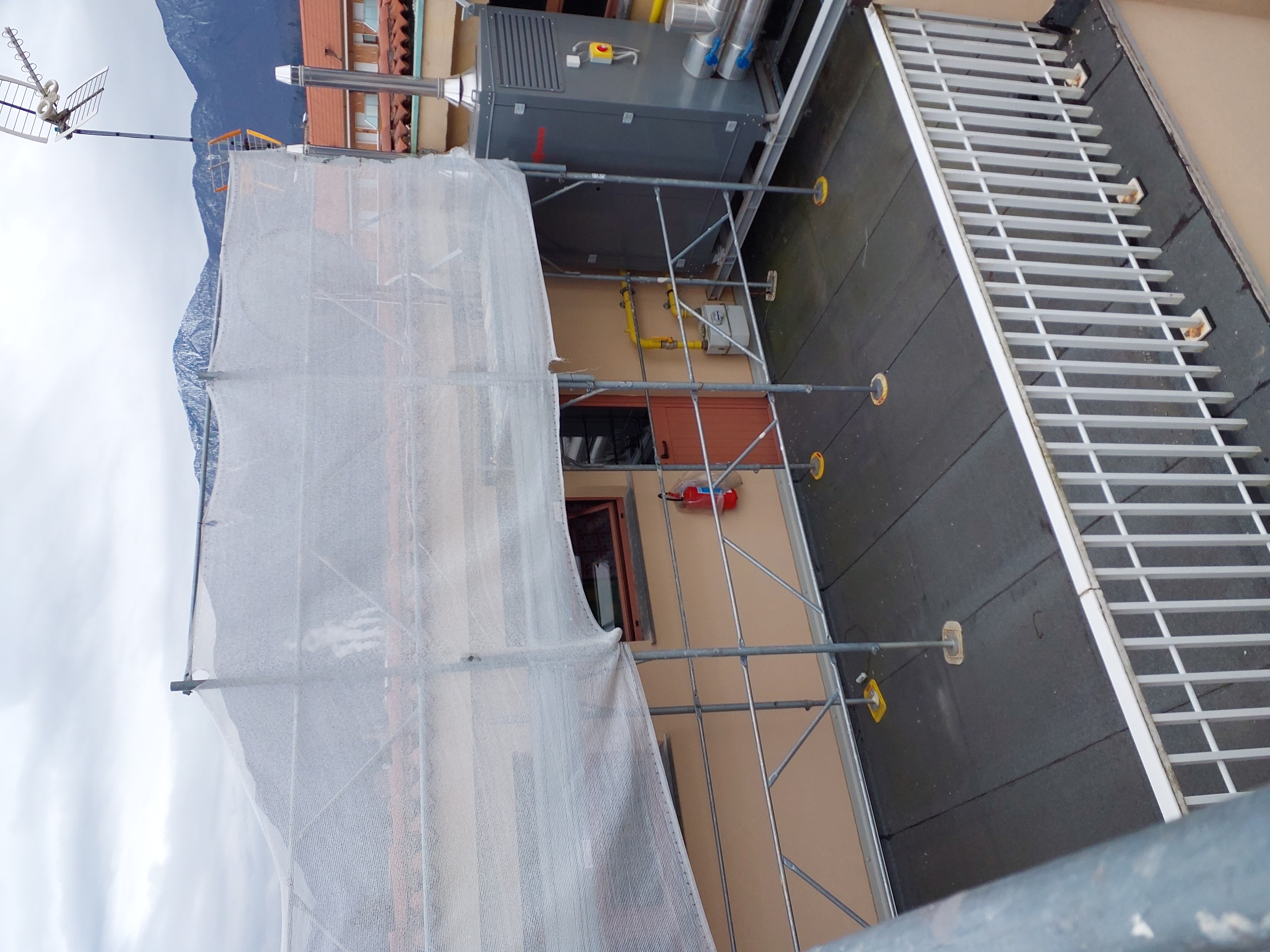 Mancato fissaggio del ponteggio sul terrazzo, adeguare. Mancato parapetto sul passaggio dal ponteggio al tetto (vedi foto)