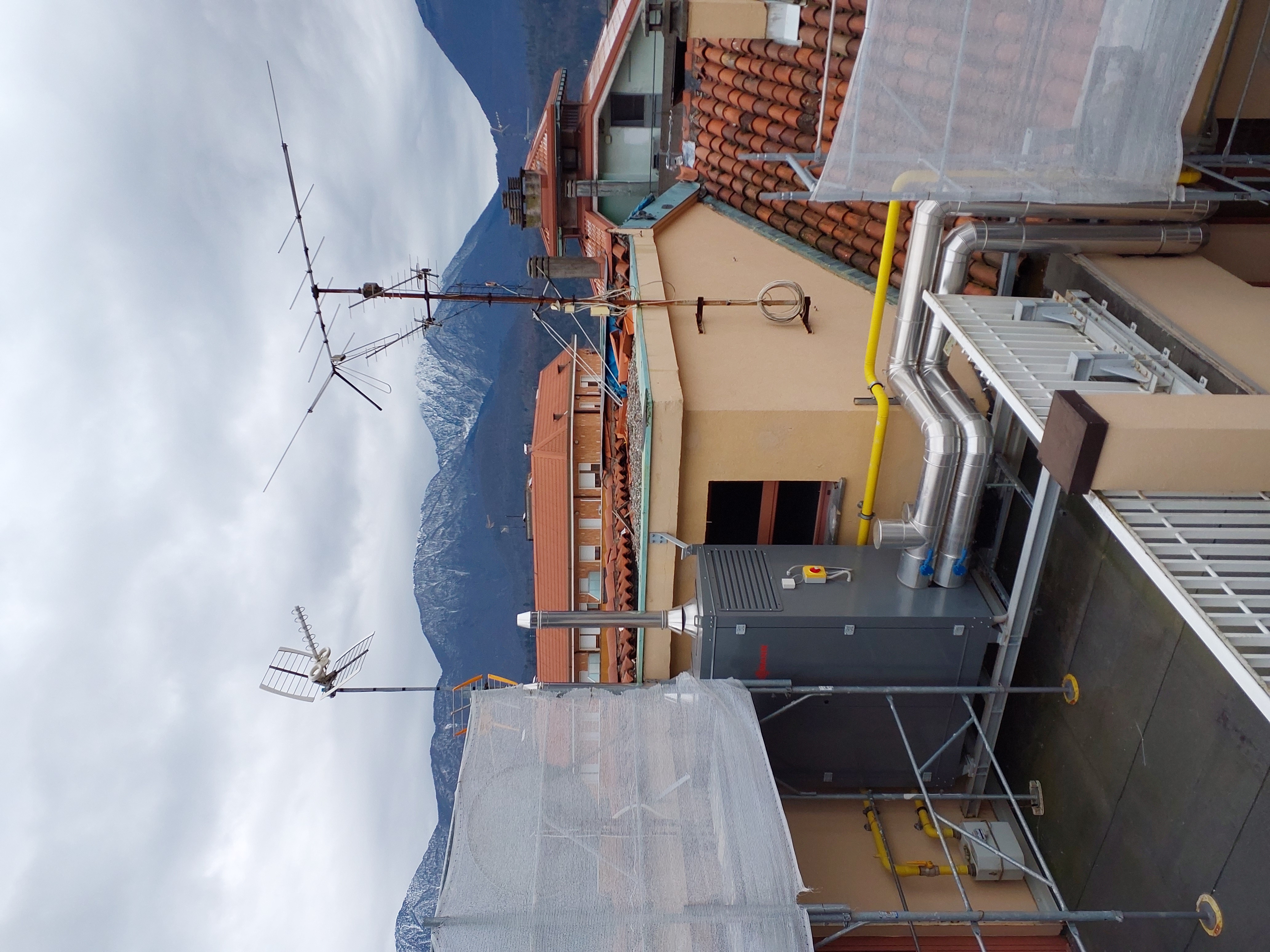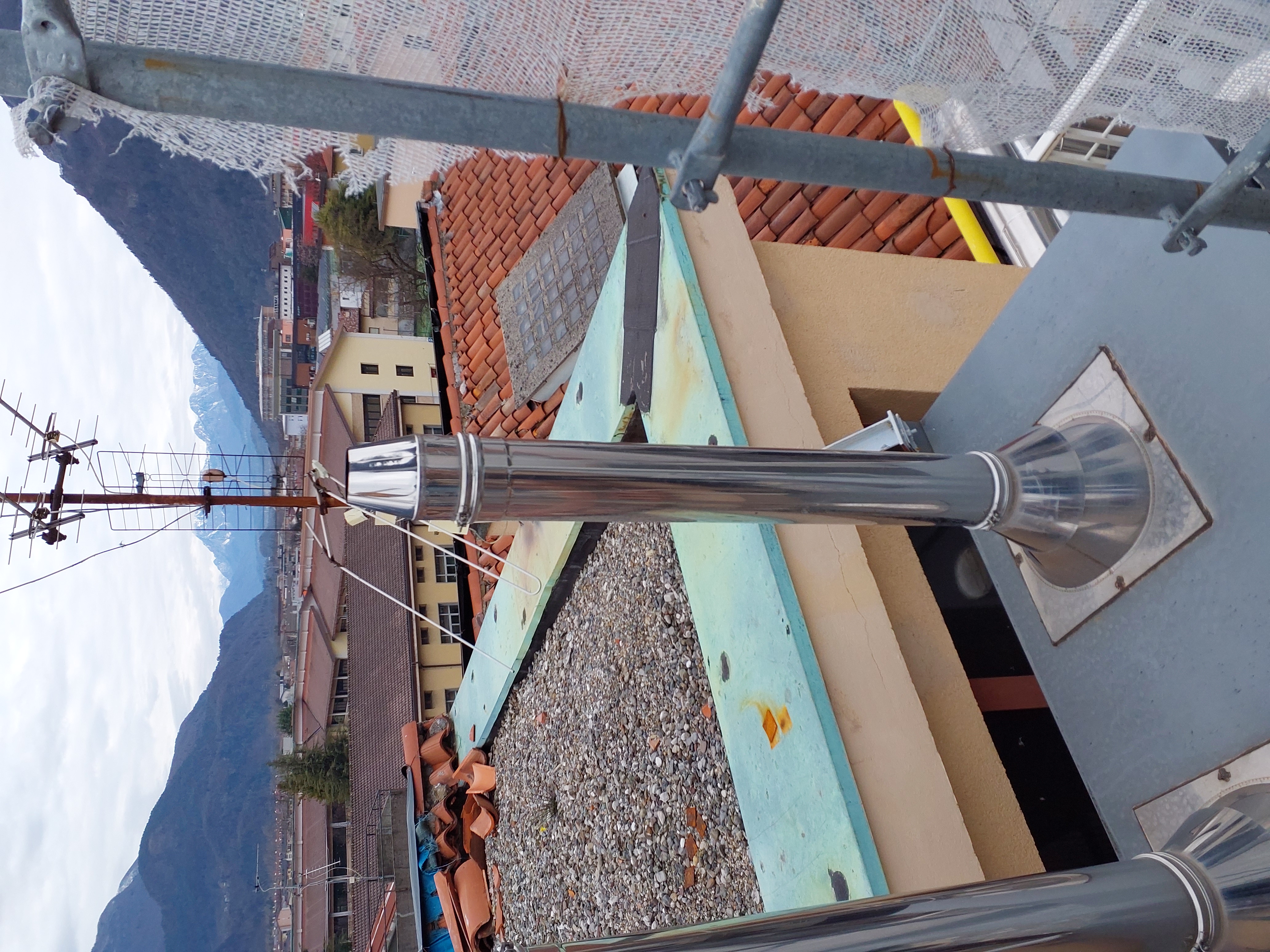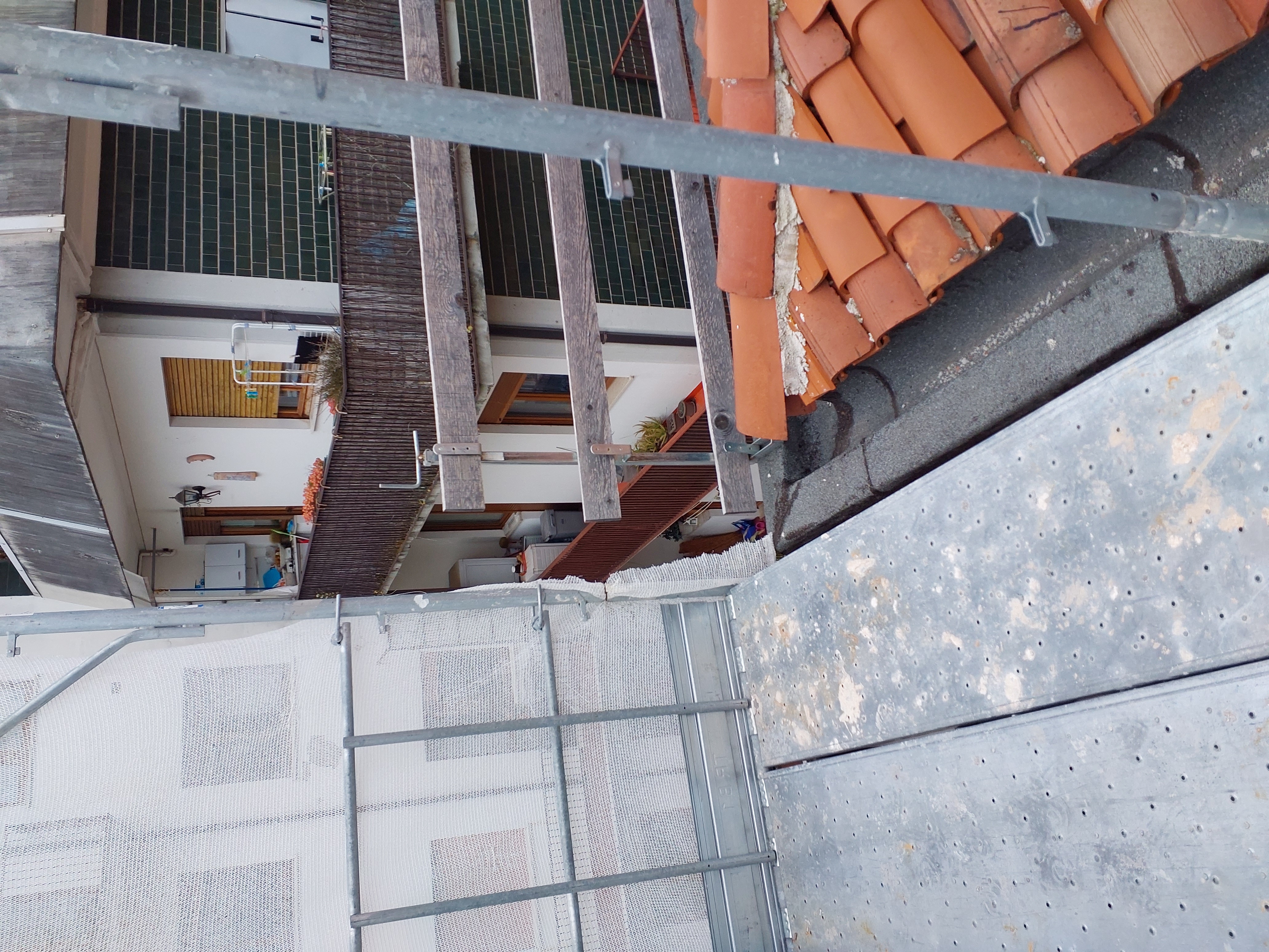 Mancato fissaggio del ponteggio sul terrazzo, adeguare. Mancato parapetto sul passaggio dal ponteggio al tetto (vedi foto)